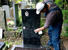 Сметаем с бортов цветника лишнюю землю, после чего переходим к самим надгробьям: вытираем памятники, немного проявляя надписи на их поверхности. Параллельно с этим протираем цветники, окончательно удаляя рассыпанную в процессе посадки землю.